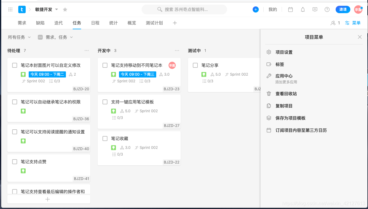 - 迭代、需求、缺陷、测试、wiki,这些功能都有。基本上一个项目的各个环节,都有了,很全面。