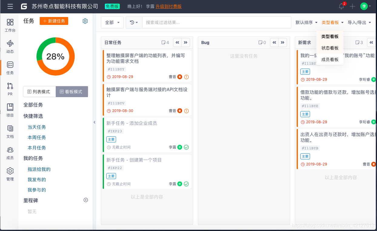- 由于主要功能是源码托管,任务模块是辅助功能。所以任务视图在进入系统后,并不是首要出现。