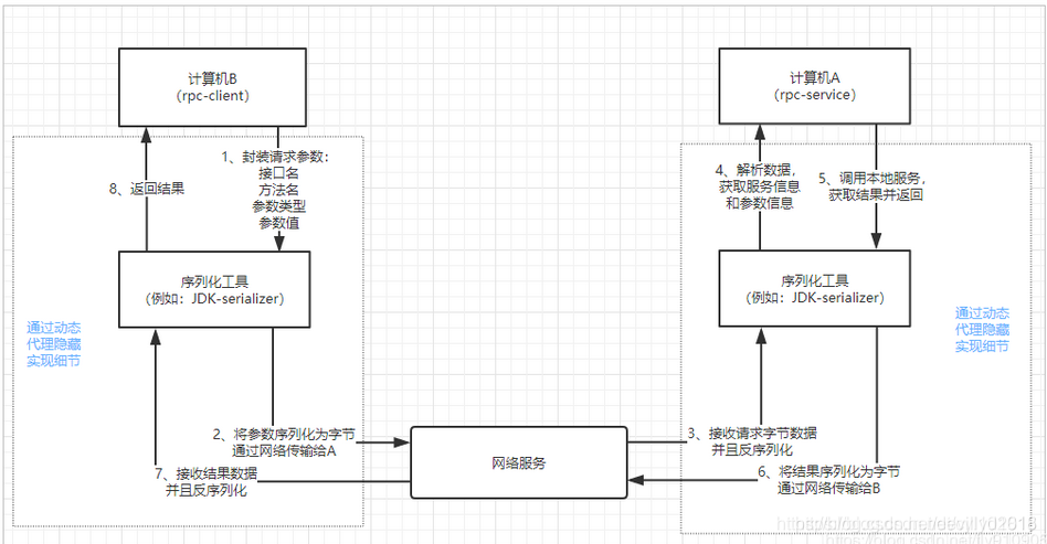 RPC的调用关系里,我们把提供具体的调用方法的系统叫服务提供者(Provider),调用服务的系统称为服务消费者(Consumer)。把对象转换为以便于网络传输的二进制或文本数据的过程,叫做序列化(Serialization);二进制或文本数据再还原为对象的过程,叫做反序列化(Deserialization)。 我们可以看到,典型的RPC处理机制包括两部分: