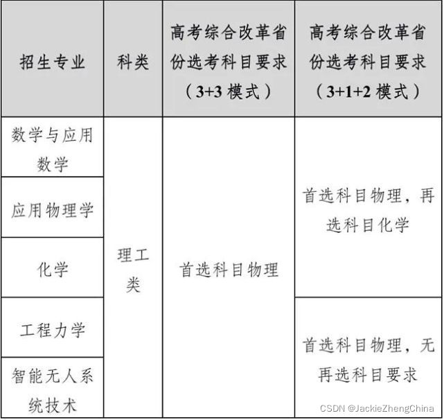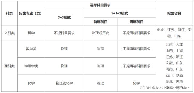 1.招生专业:数学类、物理学类、生物技术、哲学、核工程与核技术、工程力学。在非高考综合改革省份,哲学专业招收文科生,其他专业招收理科生。对实行高考综合改革省份的考生,选考科目须满足以下要求: