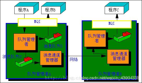 要让消息队列能有机动起来,那么一个完整的体系包括什么呢?首先是消息,然后是存放消息的队列,接着就是管理队列的管理器,以及管理器之间通信的信道: