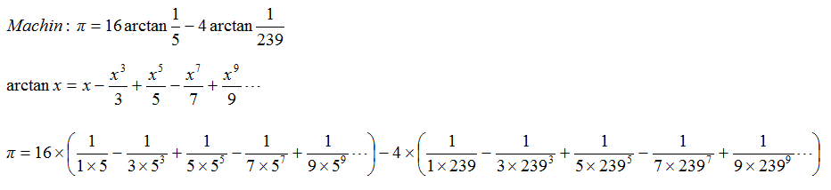 马青公式:马青公式由英国天文学教授约翰·马青(John Machin ,1686 –1751)于1706年发现。马青公式每计算一项可以得到1.4位的十进制精度。因为它的计算过程中被乘数和被除数都不大于长整数,所以可以很容易地在计算机上编程实现。