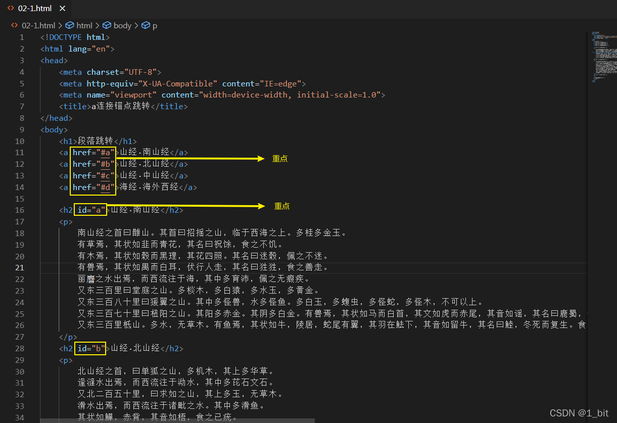 🐶1_bit:在以上代码中我们可以看到,在a标签的href中,咱们使用了如href="#a"类似的写法,这就是锚点的写法。其中 href是表示当前链接所指向的资源,那么“#a”就是资源地址,其中 # 是链接中锚点的写法,而 a 则是当前页面中某个元素的 id 值。我们可以从代码中看见,当前页面中 id 为 a 的内容则是 <h2 id="a">山经·南山经</h2> 这个元素,那么当点击 <a href="#a">山经·南山经</a> 时将会直接跳转到 <h2 id="a">山经·南山经</h2> 该部分内容。