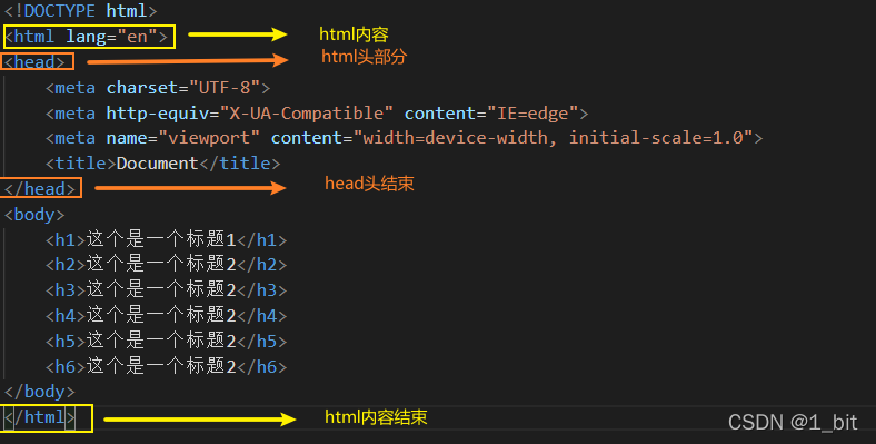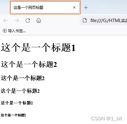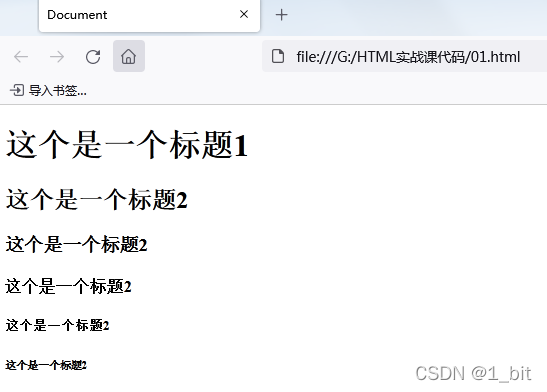 🐶1_bit: 那咱们现在来开始做个示例。在HTML中 h 标签称为标题标签,例如咱们在看一些网页内容时会发现有些文本内容会变大加粗,这个就是标题,并且这些标题有大有小,这就是标题。