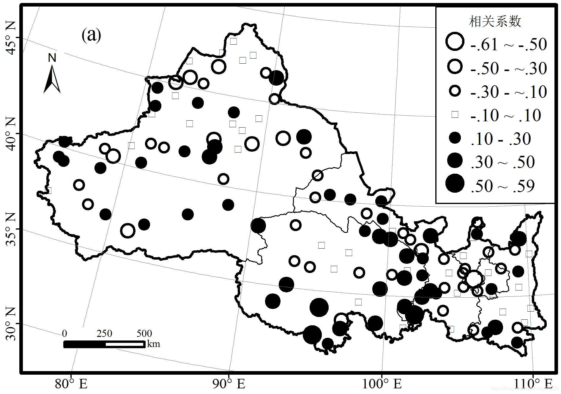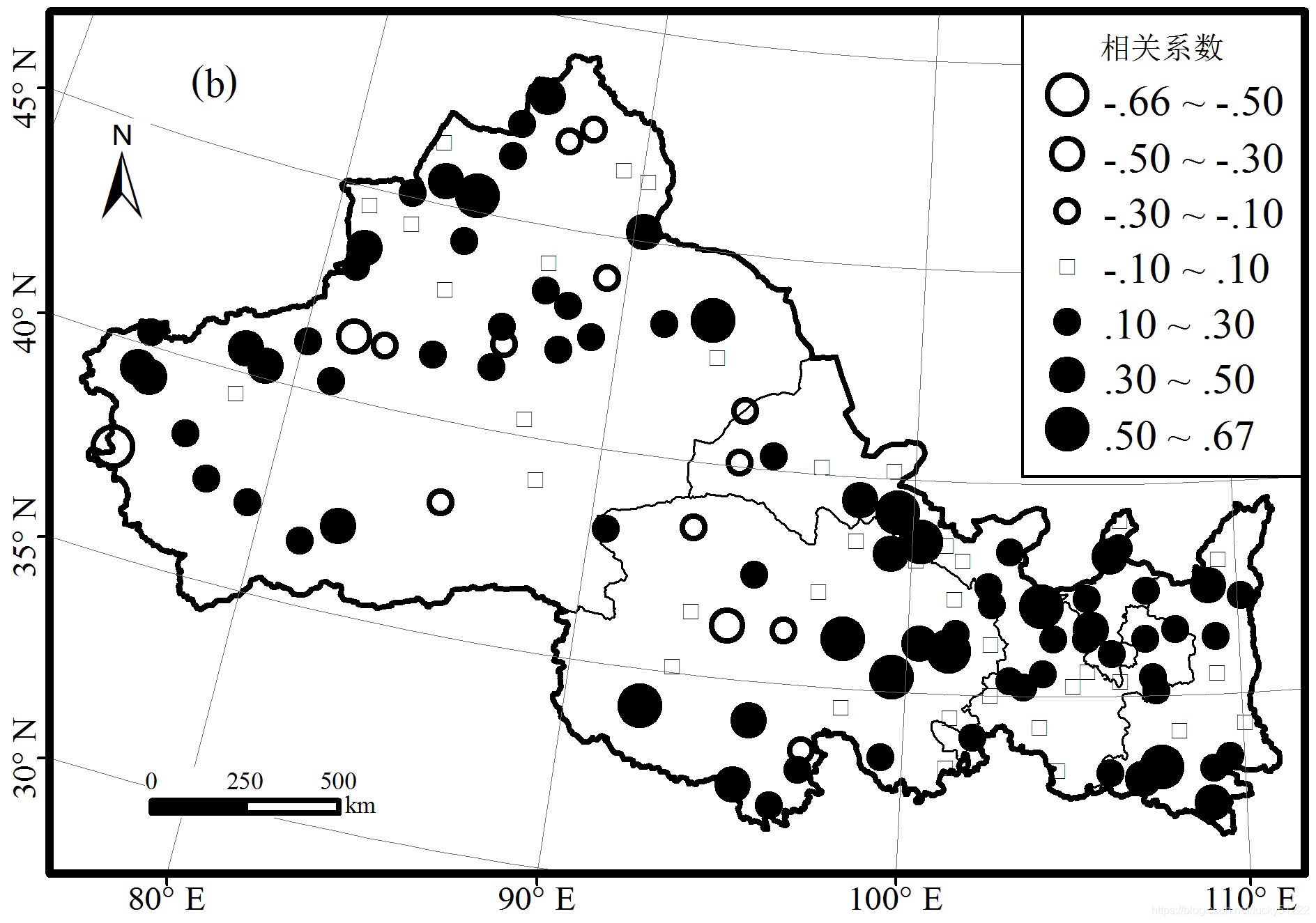 在研究植被动态变化与气候的关系时,通常通过计算植被NDVI值与气温和降水的相关系数来描述相关性的大小。如下图所示,计算了西北地区分布的气象台站与气温和降水的相关性并作图可视化。