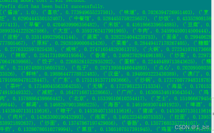 使用的方法是 jieba.analyse.textrank(),其中 text 就是我们清理过的文本,topk 是指你要得到词频前几,我这里是 topk=168 就是表示得到出现频率最多的钱 168 个词,函数其中 withWeight=True 表示结果中出现词频权重数值,例如不使用 withWeight=True 结果如下: