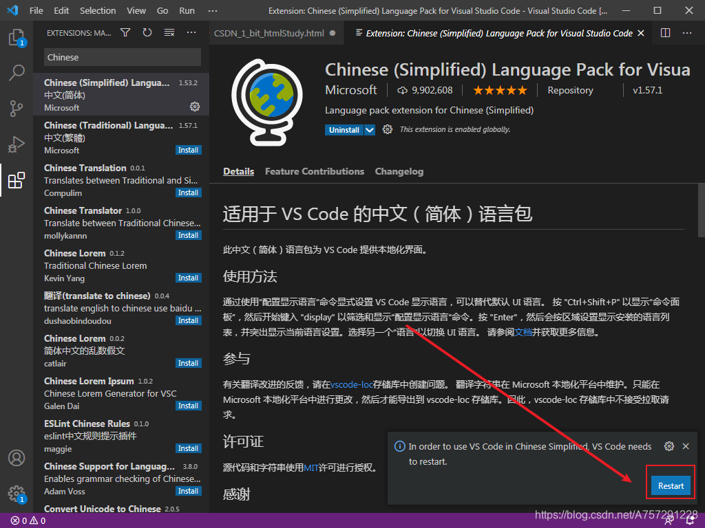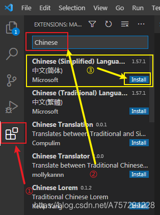 🐶1_bit:这个不难,我们先点击 vscode 编辑器左侧最下面的扩展,然后在出现的提示框中输入 Chinese 就会出现一个语言包,最后点击 install 就可以进行安装了。