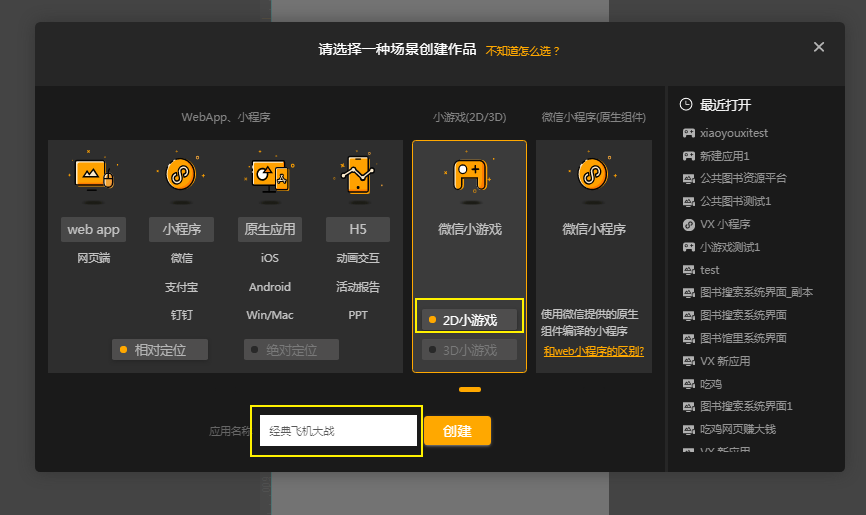 🐶1_bit:我们选择小程序游戏,选择 2D并且取个名称,我们先制作一个 2D 版本的经典飞机大战小游戏。