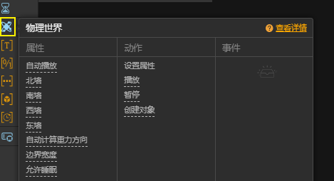 🐶1_bit:我们创建物理世界主要的原因是为了方便检测碰撞,我们首先点击前台,然后在左侧的组件栏中点击物理世界进行创建。