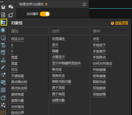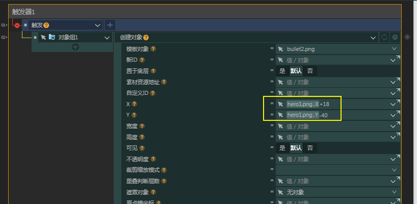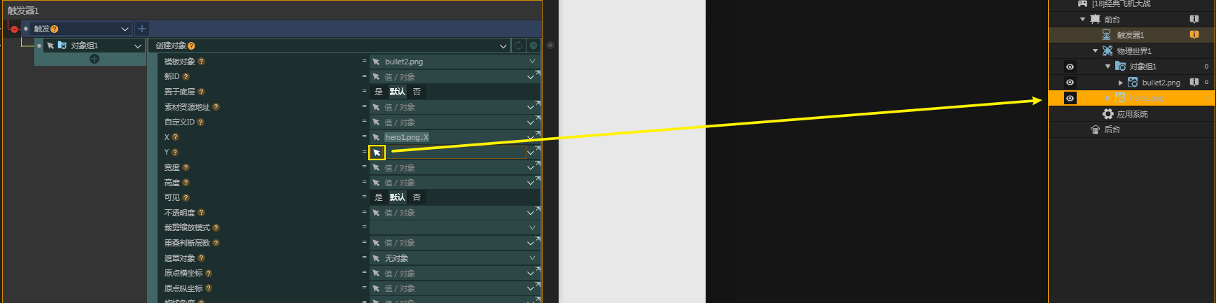 🐶1_bit:在触发器中点击事件,在事件中动作对象选择为对象组,选择对象组的动作为创建对象。