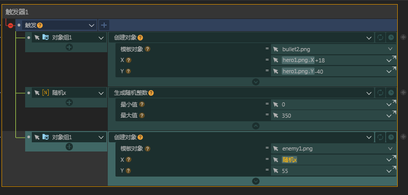 🐶1_bit:再点击到之前创建的触发器,添加一个动作为 随机x 变量进行随机赋值,赋值范围就为屏幕宽度 0 到最宽宽度减去一个单位,防止敌机在屏幕外生成;随后再创建一个敌机即可,创建敌机的 x 坐标为随机生成的 x 坐标,而 y 坐标为 -10,从屏幕上掉落就可以了。