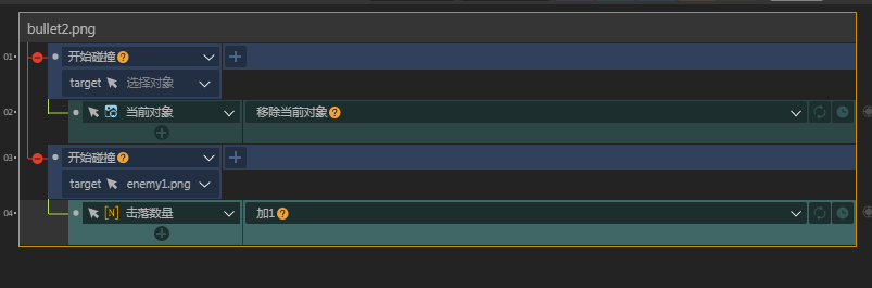 🐶1_bit:这个时候你给子弹设置一个事件,当子弹发生碰撞时就可以自动移除对象,不需要设置具体碰撞对象,这样只要碰到物理世界下添加了物体的对象,就会自动响应后面的逻辑,之后只需要在后面的逻辑中设置需要做的事为移除当前对象就可以了。