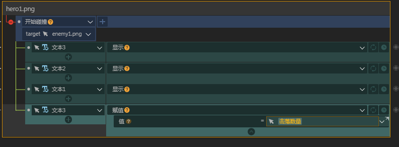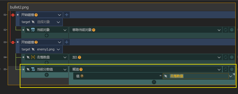 👸小媛:明白了,然后再添加一个动作让那个击落数量文本的值就等于击落数量变量就可以了。😆
