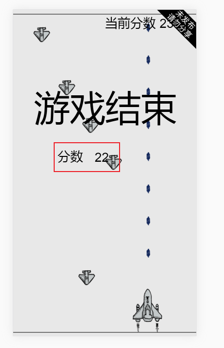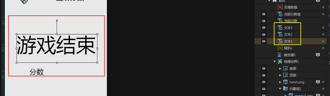 🐶1_bit:接下来我们只需要设置一下最后一步,创建几个文本,设置他们的可见为不可见,最后设置当前主角如果触碰敌机就会自动弹出游戏结束。