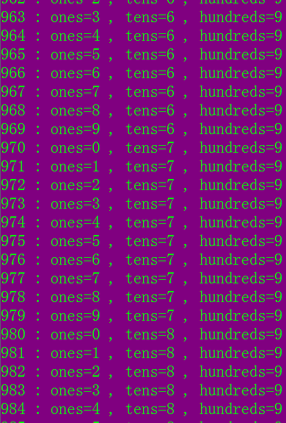 int main(){int ones,tens,hundreds,i;for(i=100;i<1000;i++){ones=i%10;tens=i/10%10;hundreds=i/100;printf("%d : ones=%d , tens=%d , hundreds=%d \n",i,ones,tens,hundreds);}