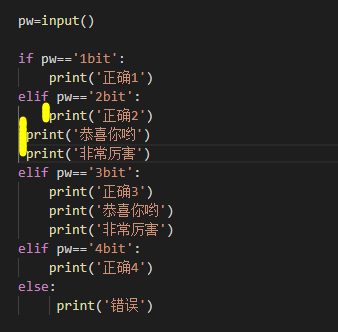 elif pw=='3bit':print('正确3')print('恭喜你哟')print('非常厉害')