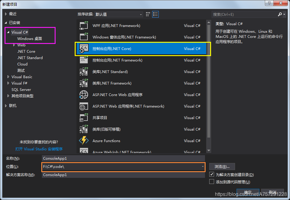🐰小C:这个简单,如图紫色区域,你选择 C#,然后看到黄色框,选择控制台程序,再选择存放到哪一个位置就可以了,橘色框就是需要存放的区域;名称这种你也可以自己改动一下,在这里我没有改;所有选项选择完毕后点击确定就可以创建项目了。
