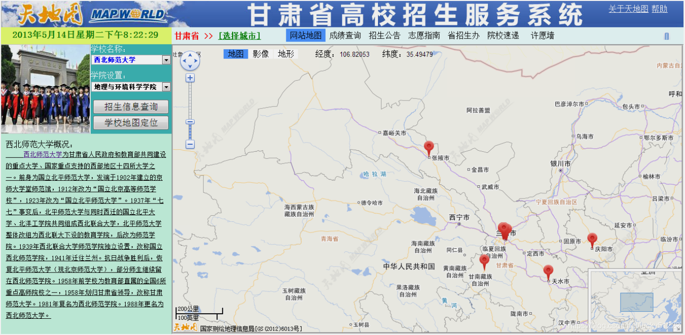 本文基于天地图提供的位置服务,采用B/S(浏览器/服务器)的系统设计开发模式,以用户的实际需求为出发点,以甘肃各高校的历年各专业招生数据为支撑,开发出了基于位置服务的高校招生服务系统,旨在为广大用户提供直接、可视化的招生服务信息。
