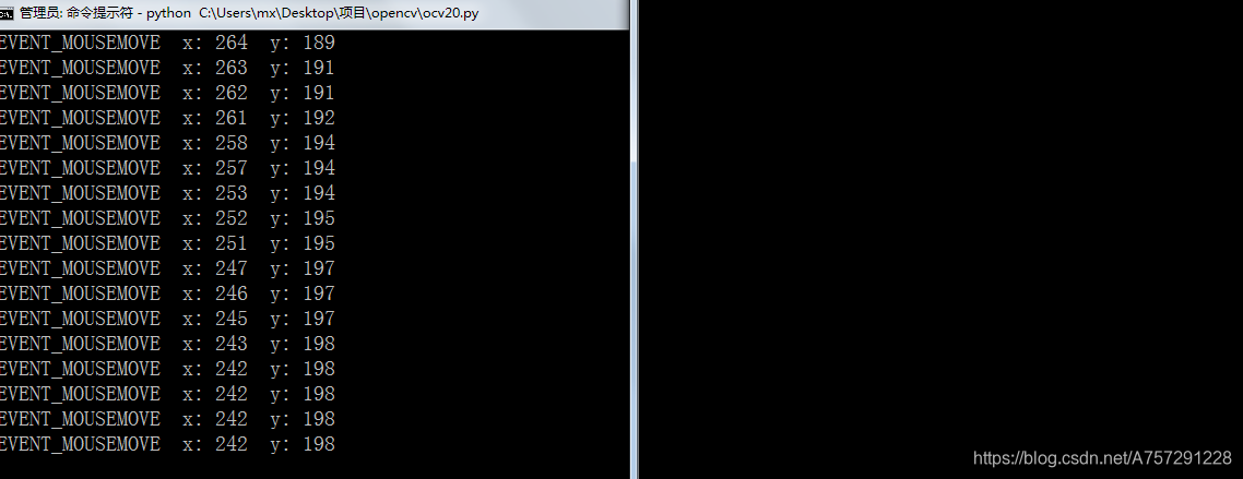 def listing(event,x,y,flags,param):if event==cv2.EVENT_MOUSEMOVE:print('EVENT_MOUSEMOVE',' x:',x,' y:',y)