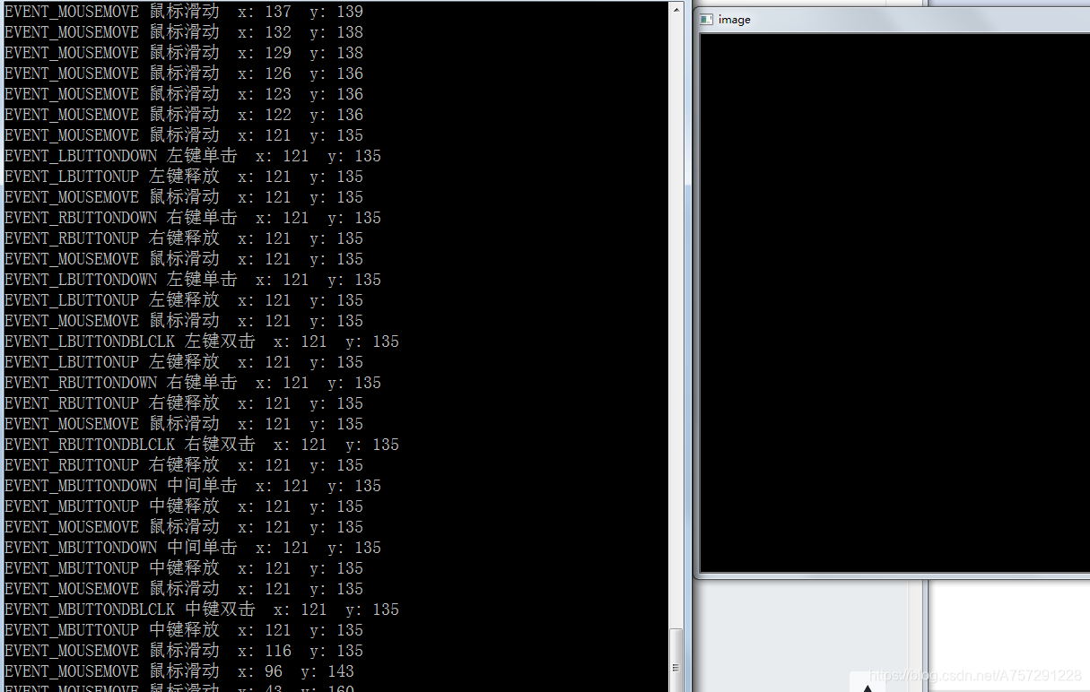 def listening(event,x,y,flags,param):if event==cv2.EVENT_MOUSEMOVE:print('EVENT_MOUSEMOVE 鼠标滑动',' x:',x,' y:',y)elif event==cv2.EVENT_LBUTTONDOWN:print('EVENT_LBUTTONDOWN 左键单击',' x:',x,' y:',y)elif event==cv2.EVENT_RBUTTONDOWN:print('EVENT_RBUTTONDOWN 右键单击',' x:',x,' y:',y)elif event==cv2.EVENT_MBUTTONDOWN:print('EVENT_MBUTTONDOWN 中间单击',' x:',x,' y:',y)elif event==cv2.EVENT_LBUTTONUP:print('EVENT_LBUTTONUP 左键释放',' x:',x,' y:',y)elif event==cv2.EVENT_RBUTTONUP:print('EVENT_RBUTTONUP 右键释放',' x:',x,' y:',y)elif event==cv2.EVENT_MBUTTONUP:print('EVENT_MBUTTONUP 中键释放',' x:',x,' y:',y)elif event==cv2.EVENT_LBUTTONDBLCLK:print('EVENT_LBUTTONDBLCLK 左键双击',' x:',x,' y:',y)elif event==cv2.EVENT_RBUTTONDBLCLK:print('EVENT_RBUTTONDBLCLK 右键双击',' x:',x,' y:',y)elif event==cv2.EVENT_MBUTTONDBLCLK:print('EVENT_MBUTTONDBLCLK 中键双击',' x:',x,' y:',y)