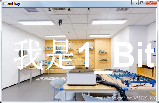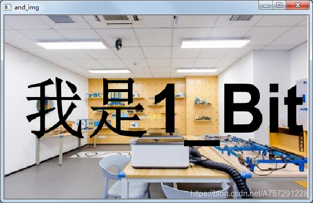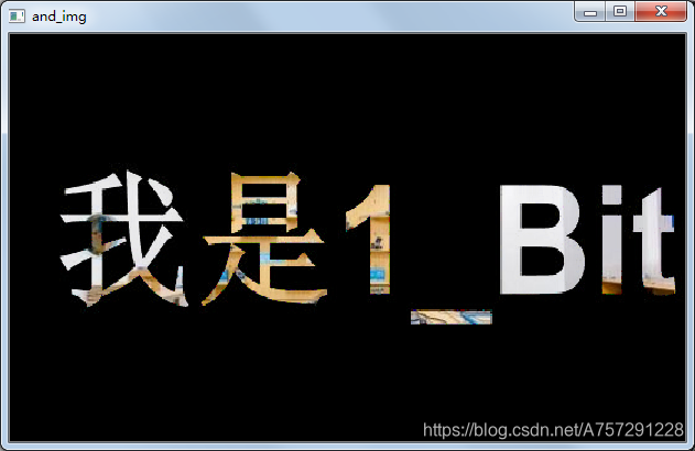 以上代码中关键代码为and_img=cv2.bitwise_and(img3,img1),在这一串代码中对img3与img1进行了逻辑与运算。由于img1图片只有“我是1_bit”文字为白色,其他区域为黑色,我们可以当成“我偶是1_bit”这个内容区域的值为1,然后黑色区域位置为0。这时黑色区域与img3图片的通道区域值进行计算,那就是0与一个内容值进行逻辑与计算,那么结果为0,img1的文字部分值为1,与img3图片相同的位置进行逻辑与计算,那么保留结果。这时,运算后的图片则应该是生成一张带有“我是1_bit”字样的图片,并且在字样区域内带有img3图片内容。结果如下: