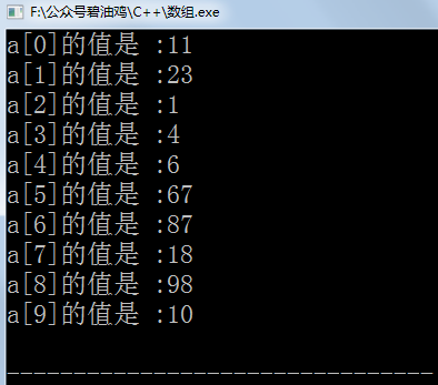 int main() {int a[10]={11,23,1,4,6,67,87,18,98,10};cout<<"a[0]的值是 :"<<a[0]<<endl;cout<<"a[1]的值是 :"<<a[1]<<endl;cout<<"a[2]的值是 :"<<a[2]<<endl;cout<<"a[3]的值是 :"<<a[3]<<endl;cout<<"a[4]的值是 :"<<a[4]<<endl;cout<<"a[5]的值是 :"<<a[5]<<endl;cout<<"a[6]的值是 :"<<a[6]<<endl;cout<<"a[7]的值是 :"<<a[7]<<endl;cout<<"a[8]的值是 :"<<a[8]<<endl;cout<<"a[9]的值是 :"<<a[9]<<endl;