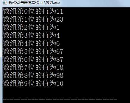 int main() {int a[10]={11,23,1,4,6,67,87,18,98,10};int i=0;for(;i<10;i++){cout<<"数组第"<<i<<"位的值为"<<a[i]<<endl;}