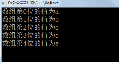 int main() {char a[5]={'a','b','c','d','e'};int i=0;for(;i<5;i++){cout<<"数组第"<<i<<"位的值为"<<a[i]<<endl;}