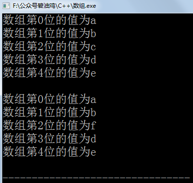 int main() {char a[5]={'a','b','c','d','e'};int i=0;for(;i<5;i++){cout<<"数组第"<<i<<"位的值为"<<a[i]<<endl;}cout<<endl;a[2]='f';for(i=0;i<5;i++){cout<<"数组第"<<i<<"位的值为"<<a[i]<<endl;}