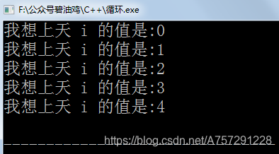 int main() {int i=0; for(;i<10;i++){if(i==5){break;}cout<<"我想上天"<<" i 的值是:"<<i<<endl;}