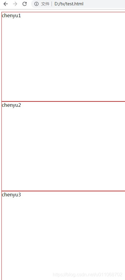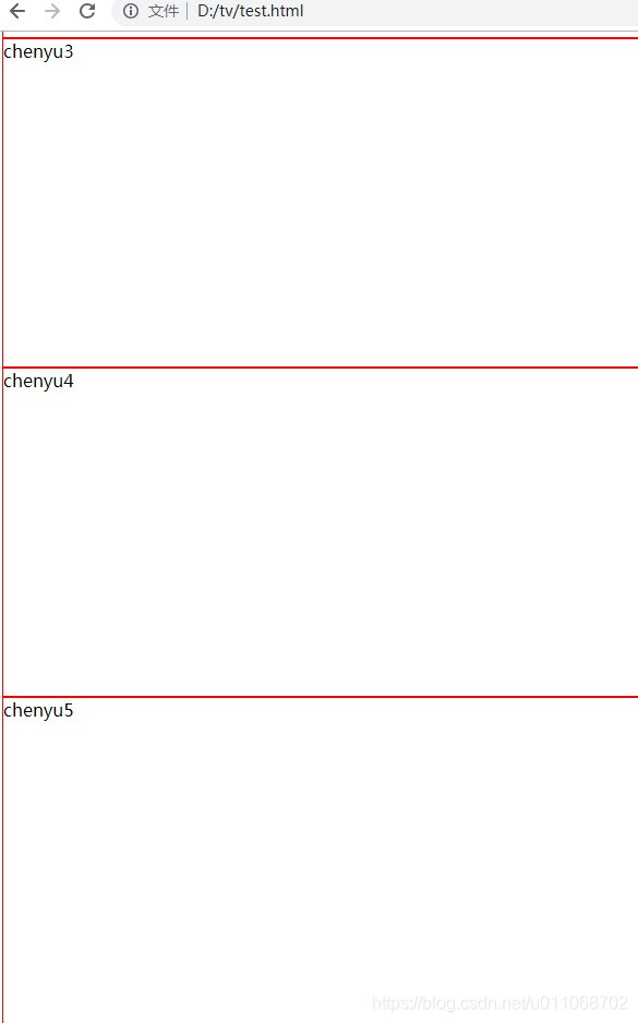 <html><head><style> .div-height{border:1px solid #F00; width:1000px; height:300px} </style> </head><body><div id="div1" class="div-height" >chenyu1</div><div id="div2" class="div-height" >chenyu2</div><div id="div3" class="div-height" >chenyu3</div><div id="div4" class="div-height" >chenyu4</div><div id="div5" class="div-height" >chenyu5</div></body>