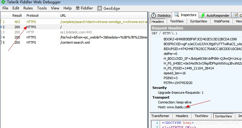 2 ) 接下来打开Fiddler,我们在浏览器里面输入www.baidu.com,我们在Fiddler里面的左边可以看到一系列的链接变化