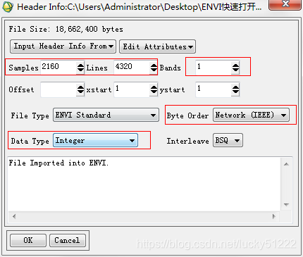 ENVI中点击File->Open File as->Binary会弹出填写元数据的窗口,填写基本信息: