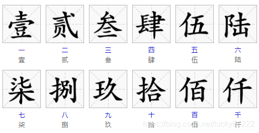 1——壹,2——贰,3——叁,4——肆,5——伍,6——陆,7——柒,8——捌,9——玖,10——拾