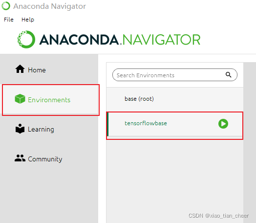 - 找到Environments,点击对应环境,我的是tensorflowbase;
