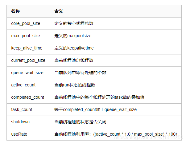 包括线程池运行状态、核心线程数、最大线程数、任务等待数、已完成任务数、线程池异常关闭等信息