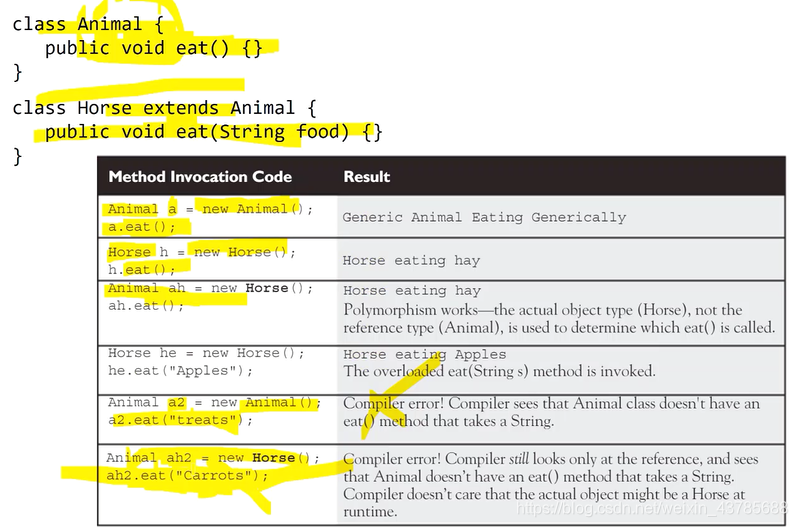 第二行:如果声明的是子类型,赋值也是子类型。方法调用时不满足子类方法参数要求,满足了父类方法参数要求,则调用父类方法。(重载时父类方法在子类中有备份)