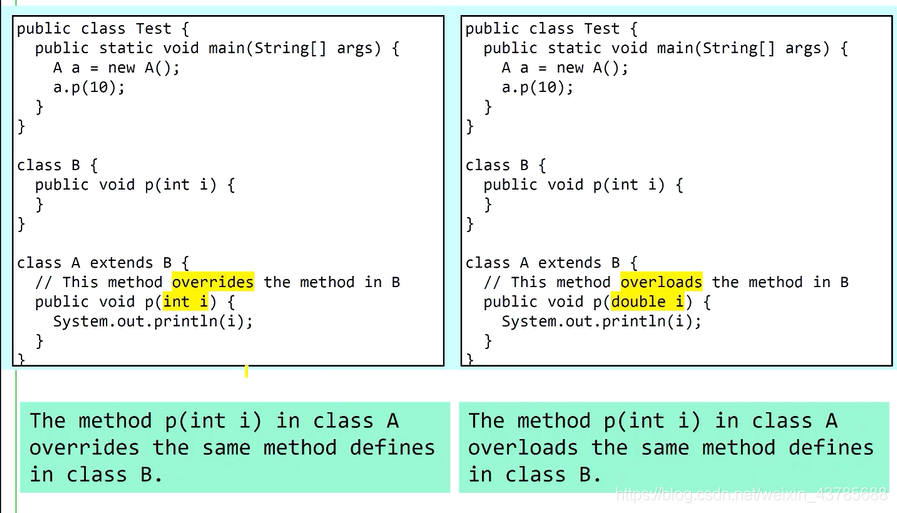 8.重载必须有不同的参数列表;返回值、修饰词、异常可相同可不同;可以在本类或者子类中重载。