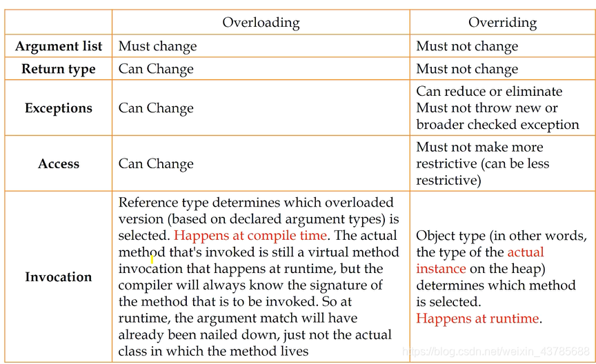 7.重载方法在编译阶段时决定具体调用哪个方法(静态类型检查),重写在运行时决定具体调用哪个方法(动态类型检查)。