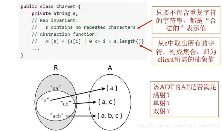 RI:R->boolean(表示不变性)某个具体的表示是否是合法的。也可以将RI看成所有表示值的一个子集,包含了所有合法的表示值。同时可以将RI看作描述什么是合法表示值的条件。