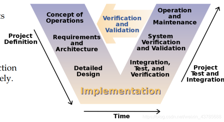瀑布型的扩展。编码阶段结束后,处理步骤向上弯曲,呈现V形,而不是瀑布模型的线性模式。下图展示了开发生命周期的每个阶段与其相关测试阶段之间的关系。