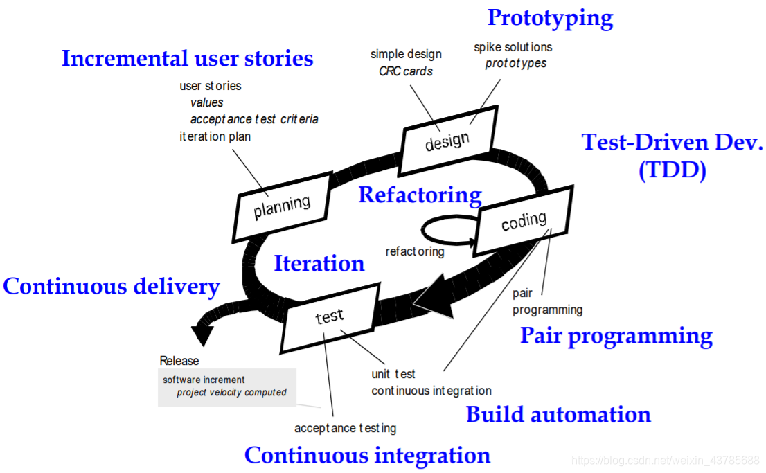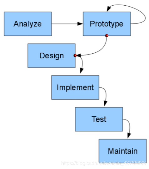 在概念、启动、分析、设计、构建、测试、实现和维护的各个阶段稳步向下流动(就像瀑布一样)。易于使用,但事后的改变代价高昂。