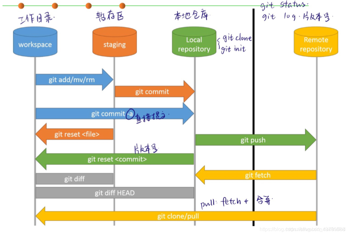 3.每个文件都术语下列三种状态之一:已修改(工作目录中的文件与git存储库中的文件不同,但不在暂存区域中)、暂存(文件已修改并已添加到暂存区域)、提交(文件在工作目录和git目录中保持相同)。