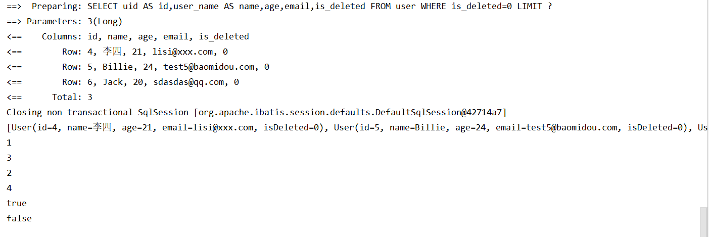 @TestpublicvoidtestPageVo(){// 第1页,每一页显示3条数据// select uid,user_name,age,email from user where age > ? LIMIT ?Page<User> page =newPage<>(1,3);userMapper.selectPageVo(page,20);System.out.println(page.getRecords());// 获得当前页数据System.out.println(page.getCurrent());// 获得页码System.out.println(page.getSize());// 获得每页显示条数System.out.println(page.getPages());// 获得总页数System.out.println(page.getTotal());// 获得总记录数System.out.println(page.hasNext());// 是否有下一页System.out.println(page.hasPrevious());// 是否有上一页}