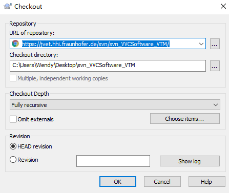 2、如果你之前(HEVC)时已经下载好了SVN,直接在桌面点击右键SVNcheckout,出来的界面输入https://jvet.hhi.fraunhofer.de/svn/svn_VVCSoftware_VTM/ 即可。如果你没有下载SVN,请先下载SVNhttps://tortoisesvn.net/。