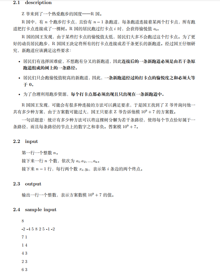 经典的树上启发式合并题目,维护对应子树的从当前点到子树内一个节点这个链待定,其他部分已经确定的方案数,这个东西按照对应点到根节点的路径点权和为下标存在一个权值线段树中,然后维护这个权值线段树可以线段树合并。
