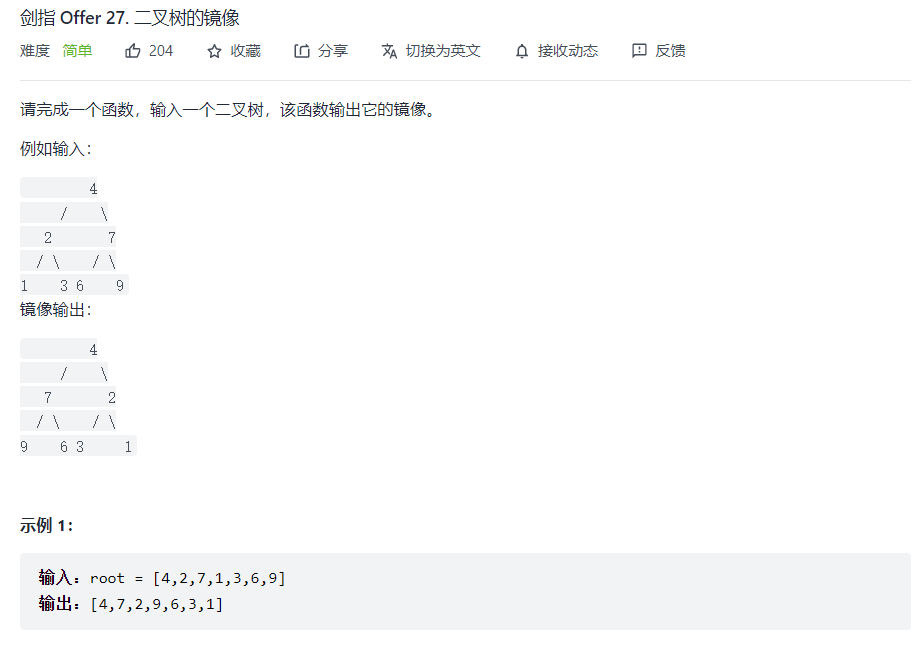 public:TreeNode* mirrorTree(TreeNode* root) {if(root==NULL) return NULL;TreeNode *right=mirrorTree(root->left);TreeNode *left=mirrorTree(root->right);root->right=right;root->left=left;return root;}