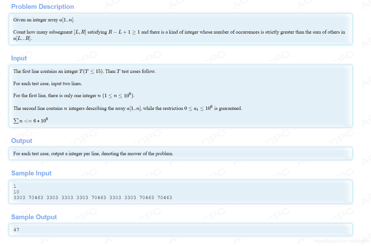 思路:先对每一个数求出对应的位置排列,S[j]代表1-有多少个i,易得s[r]-s[l]>r-l-(s[r]-s[l])的时候子区间{l+1,r}是合法的,然后呢,我赛时就不知道怎么处理二阶的前缀和,数据结构菜鸡。