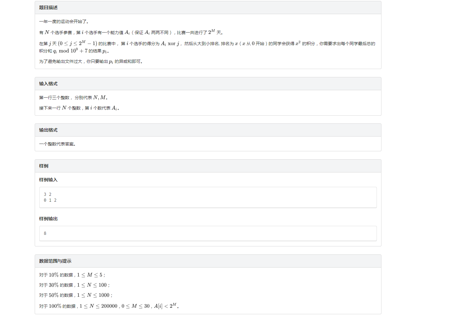 int main(){mi[0]=1;for(int i=1;i<=30;i++) mi[i]=mi[i-1]<<1;scanf("%d%d",&n,&m);for(int i=1;i<=n;i++){scanf("%d",&a[i]);build(i);}ll ans=0;for(int i=1;i<=n;i++){ask(i);double tot=0,pre=0;for(int j=0;j<=30;j++){tot+=0.5*(now[j]*now[j]+2*pre*now[j]);//if(now[j]) printf(" j=%d now=%d tot=%lf pre=%lf\n",j,now[j],tot,pre);pre+=0.5*now[j];}//printf("i=%d tot=%lf\n",i,tot);ans^=(ll)(tot*mi[m])%mod;}printf("%lld",ans);return 0;