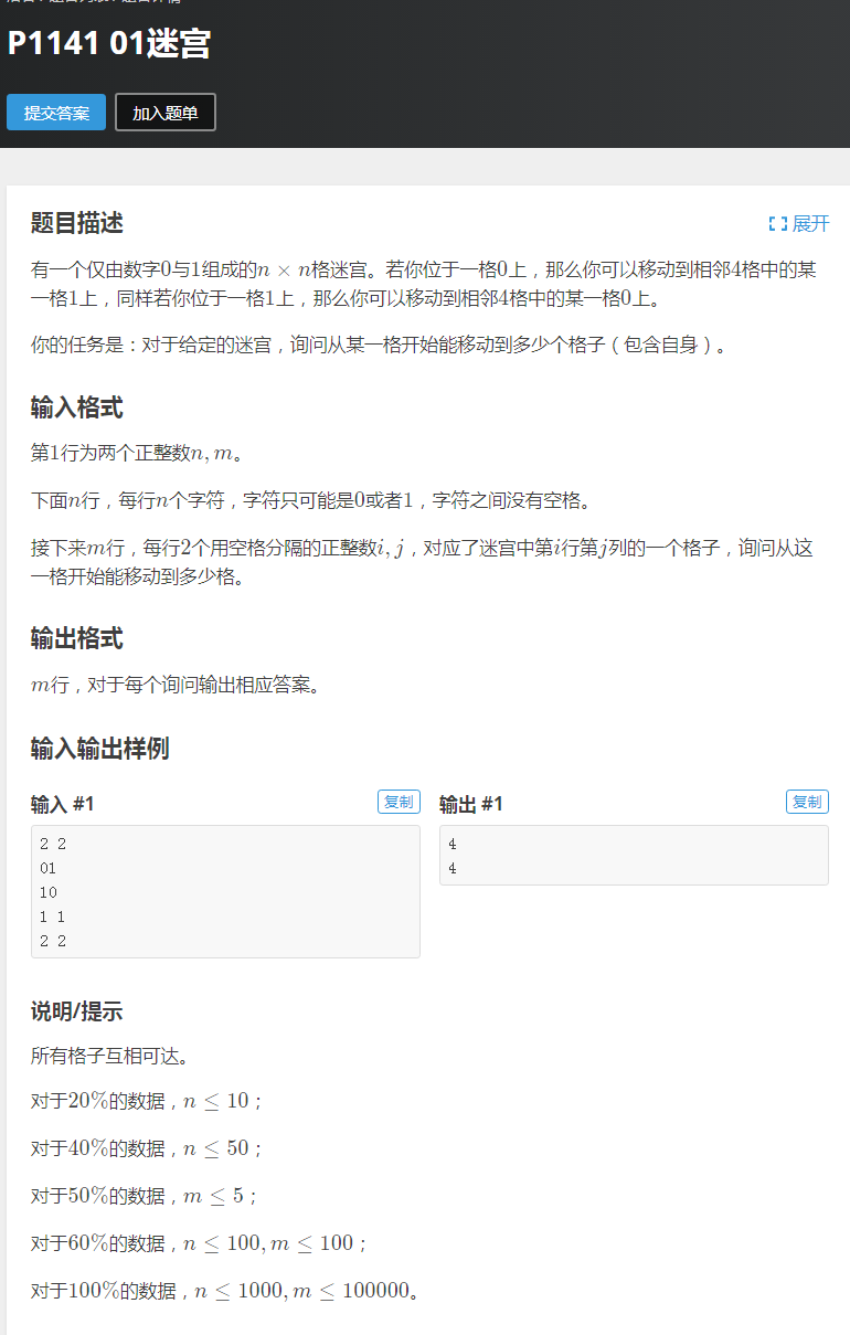 long long bfs(int x,int y){if(same[x][y]){long long b=same[x][y] % 1331;long long a=same[x][y] / 1331;return dp[a][b];}if(dp[x][y]) return dp[x][y];queue<int>xq;queue<int>yq;xq.push(x);yq.push(y);jd[x][y]=0;int tot=1;while(!xq.empty()){int X,Y;X=xq.front();Y=yq.front();int nx,ny;for(int i=0;i<=3;i++){nx=X+dx[i];ny=Y+dy[i];if(nx<=m&&nx&&ny<=m&&ny&&a[nx][ny]+a[X][Y]==1&&jd[nx][ny]){jd[nx][ny]=0;same[nx][ny]=hash(x,y);tot++;xq.push(nx);yq.push(ny);}}//a[X][Y]=-10;xq.pop();yq.pop();}return dp[x][y]=tot;